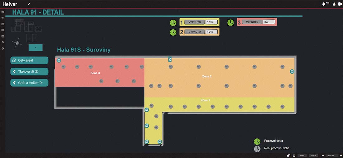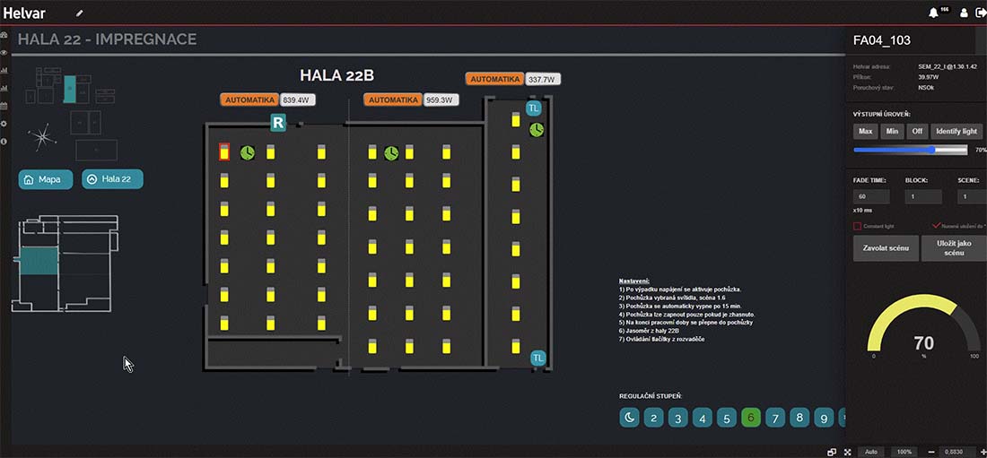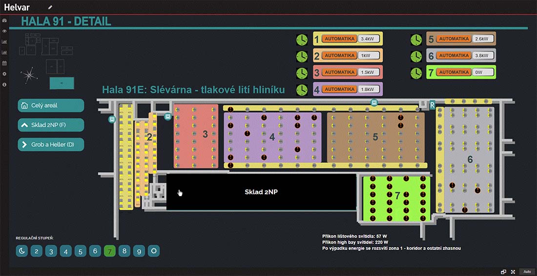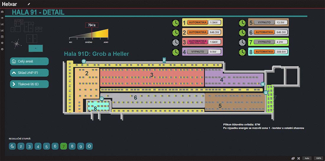 Velkou předností je variabilita časových programů, které jsou k dispozici jednotlivým mistrům prostřednictvím intuitivního webového rozhraní. Detailní přehled o spotřebách energií jednotlivých skupin a v neposlední řadě komplexní vizualizace, díky které jsou v jednom místě přehledně všechny hala pod kontrolou s možností připojení dalších hal v budoucnu. V každé hale systém řízení osvětlení generuje velké úspory díky regulaci svítidel příspěvkem denního osvětlení.